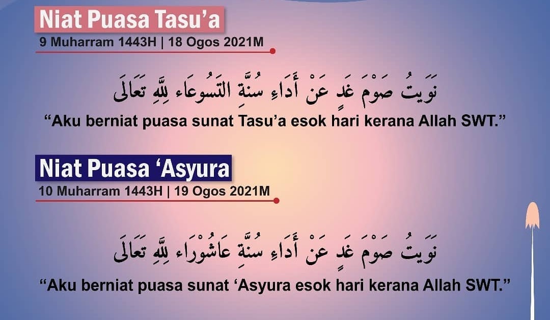 Tarikh & niat puasa hari asyura / hari tasu'a 2021 di malaysia. Niat puasa tasu'a tanggal 9 muharram. Berikut adalah bacaan niat puasa tasu'a dan puasa asyura serta keutamaan puasa di bulan muharram. Puasa arafah adalah sebuah ibadah sunnah tahunan yang di kerjakan bertepatan dengan hari arafah atau tanggal 9 dzulhijjah dalam perhitungan kalender hijriyah. Hari tasu'a tahun ini tepat pada hari jumat besok 28 agustus 2020. Bacaan niat puasa tasu'a 9 muharam نَوَيْتُ صَوْمَ غَدٍ عَنْ أَدَاءِ سُنَّةِ التَا سُوعَاء لِلهِ تَعَالَى nawaitu shauma ghadin 'an adâ'i sunnatit tasû'â. Niat puasa tasu'a dan asyura ( 9 dan 10 muharram ). نَوَيْتُ صَوْم تَاسُعَاء سُنَّة لله تَعَالى.
